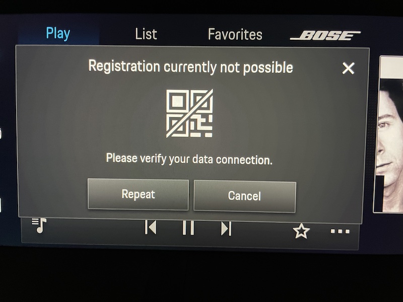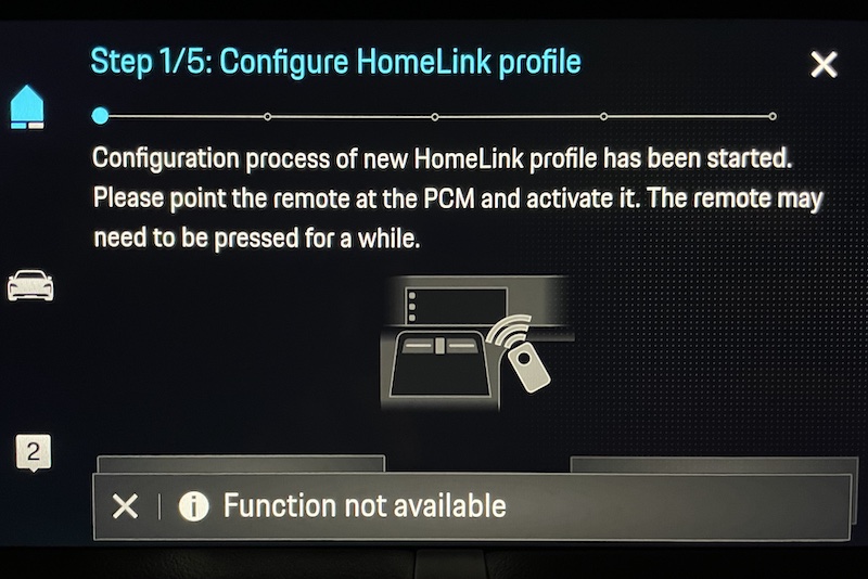 Once that was working, there were other random and confusing problems, like these two affecting the setup of the Apple Music feature, something Porsche advertise a lot, but has proven to be one of the weakest parts of the infotainment in my experience, and the HomeLink garage door opener. The “Function not available” error shown there is one of its favourite errors, randomly appearing on the HomeLink function even after it is set up.